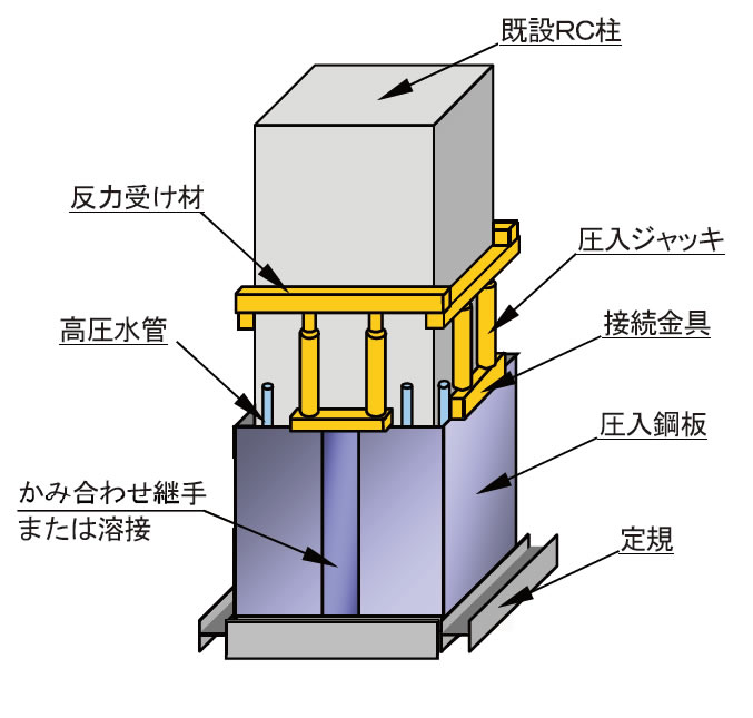 地中部鋼板圧入耐震補強工法は、地表面から鋼板を油圧ジャッキ等により地中部へ圧入することにより地中部の既設RC柱等を補強する工法です。補強鋼板は、高圧水を噴射させて地山を乱しながら圧入します。従来行なっていた地中部補強のための既設RC柱周りの仮土留め工および掘削・埋戻しが不要となり、大幅な工期短縮を図ることができます。