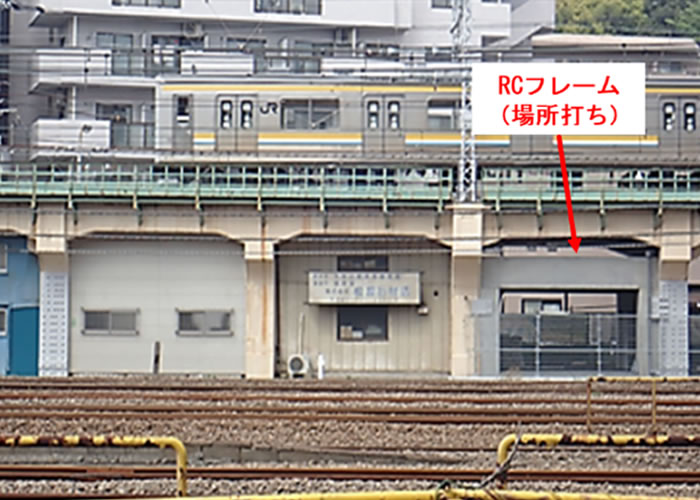 ラーメン高架橋の一部の径間に、鉄筋コンクリート部材で構成したラーメン構造の補強体であるRCフレームを設置することにより、高架橋全体の耐震性能を向上させる工法です。