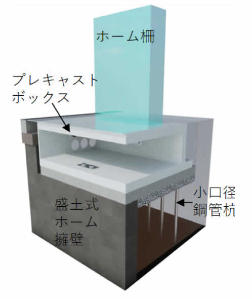 ホーム上の安全性向上のため、既設ホームへのホーム柵設置が求められていますが、盛土式ホームの場合、ホーム柵設置のため、基礎の構築が必要となります。本技術は軽量の高強度プレキャストボックスと人力打設可能な小口径杭を組み合わせることにより、簡易に基礎を施工できる工法です。