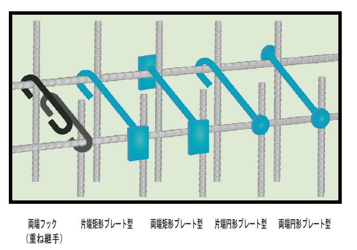 半円形フックに比べて定着部がかなり小さく、扱いやすいため、両端半円形フックでは施工が困難な場所でも迅速かつ、熟練工でなくても容易に施工できます。(矩形プレートの場合、短辺2φ、長辺4φ程度。半円形フックは曲げ内径が5φ〜6φ。φ;鉄筋母材径)
